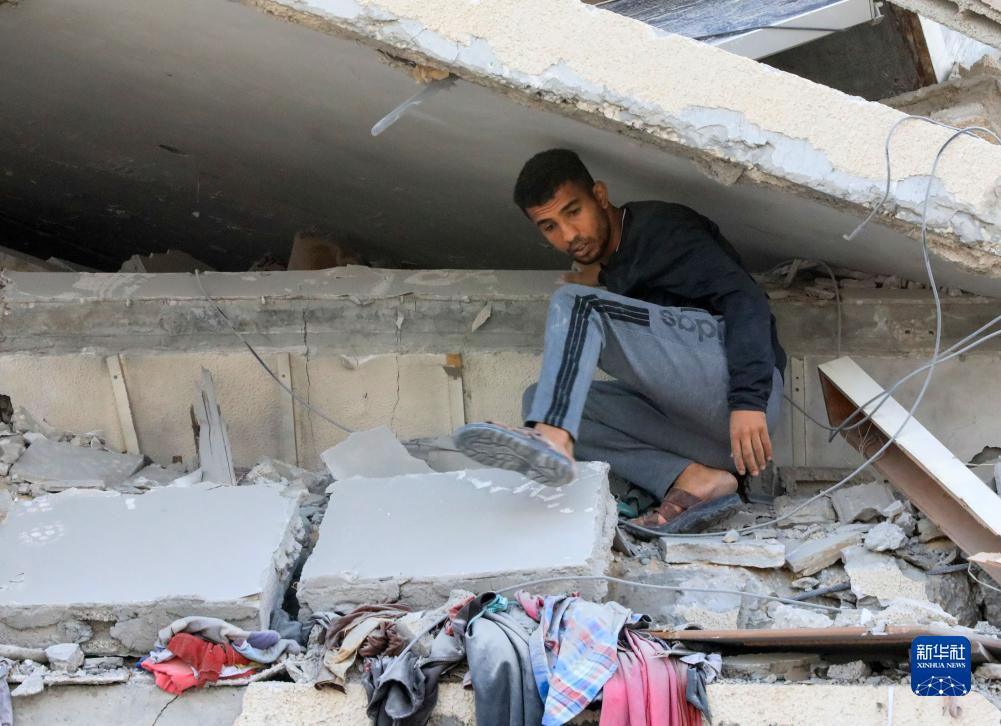 10月27日,在加沙地帶南部城市汗尤尼斯,巴勒斯坦人查看以軍襲擊后的受損建筑。