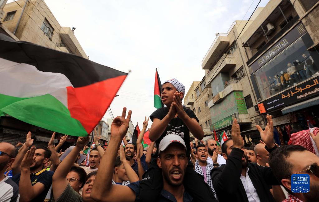當(dāng)日,民眾在安曼參加游行,表達(dá)對巴勒斯坦人民的支持。