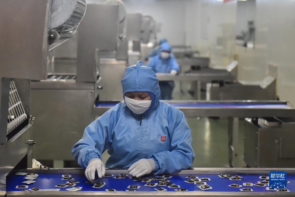 10月27日,工人在山東省聊城市東阿縣東阿阿膠股份有限公司阿膠世界體驗工廠阿膠糕生產線上工作。