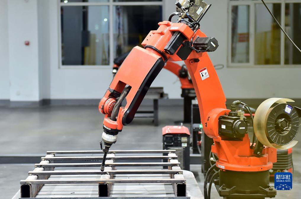 10月26日在山東省聊城市臨清市新森機械有限公司拍攝的焊接機器人。