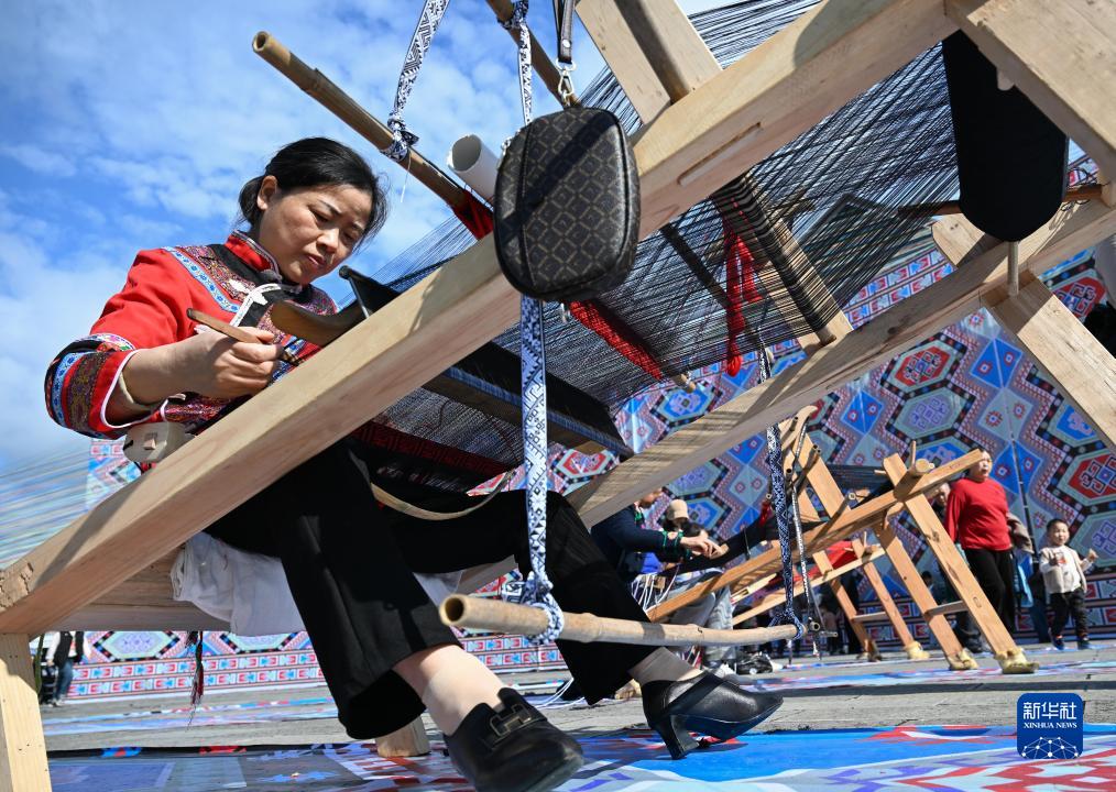 當(dāng)日,數(shù)十名織錦女工在湖北省來鳳縣龍鳳文化中心廣場現(xiàn)場進(jìn)行“西蘭卡普”制作,普及非遺文化。