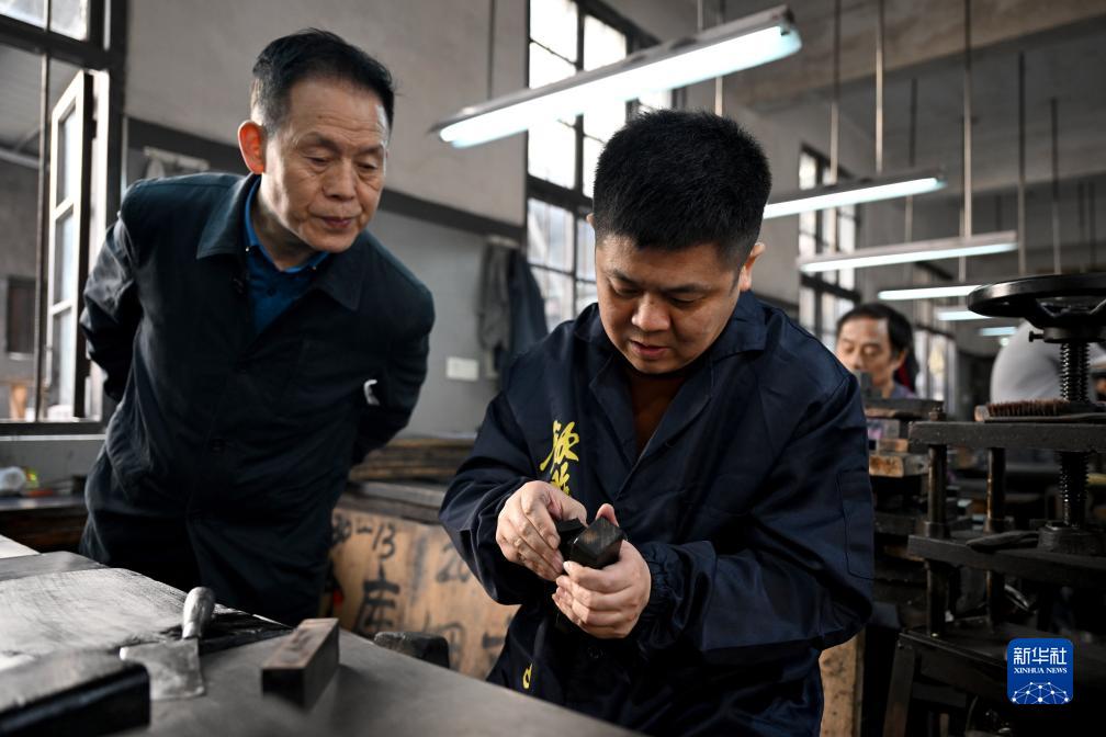 10月24日,在安徽省黃山市歙縣老胡開文墨業有限公司,周健(右)在父親周美洪的注視下從墨模中取出壓制好的墨。
