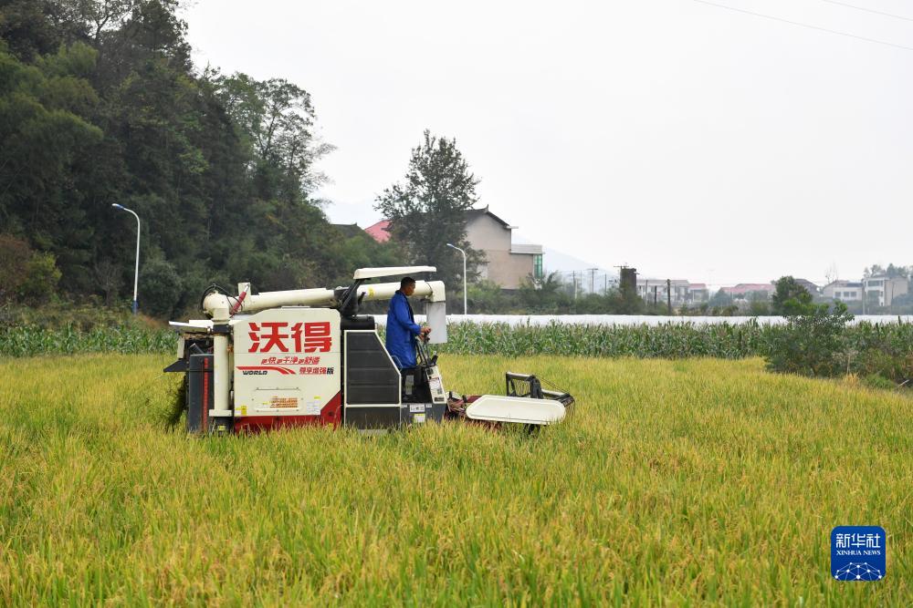 10月28日,在位于婁底市雙峰縣永豐街道松坪村的“稻再油”示范片,農機手駕駛收割機收割再生季稻谷。