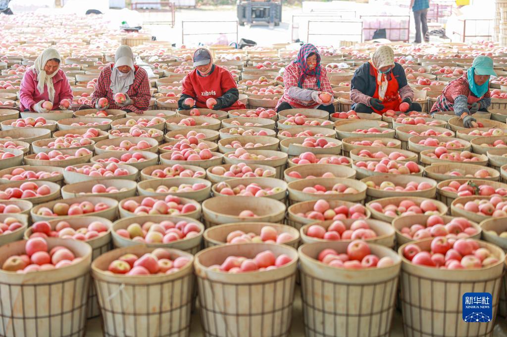連日來,山東省榮成市各大蘋果園里一派繁忙景象,果農們抓緊時間收獲蘋果,分揀、裝運發往各地市場。