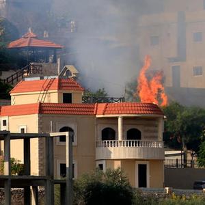 10月28日,在黎巴嫩邁斯杰貝勒,一處居民區遭炮擊后起火。