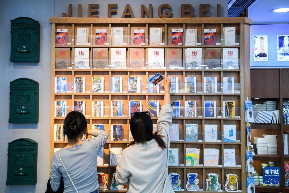 10月29日,游客在位于督郵街的解放碑主題郵局選購明信片。