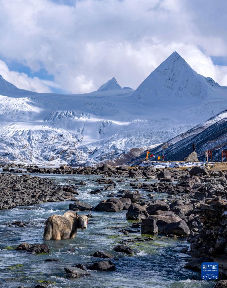 一頭牦牛站在薩普雪山腳下的河流里(10月28日攝)。