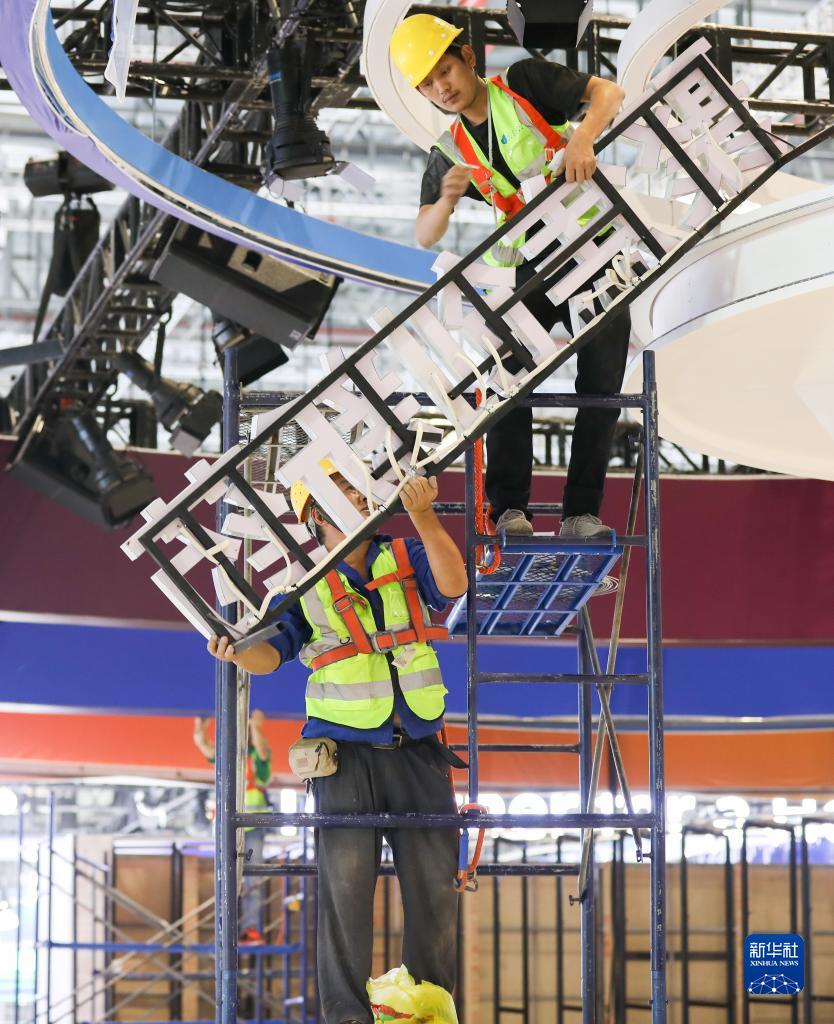 工作人員在國(guó)家會(huì)展中心(上海)內(nèi)部布展施工(10月29日攝)。