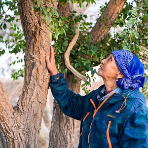 10月28日,德力格為胡楊樹修枝。
