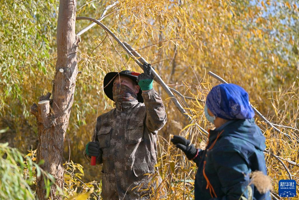 10月28日,德力格(右)和兒子蘇虎慶給胡楊剪枝。