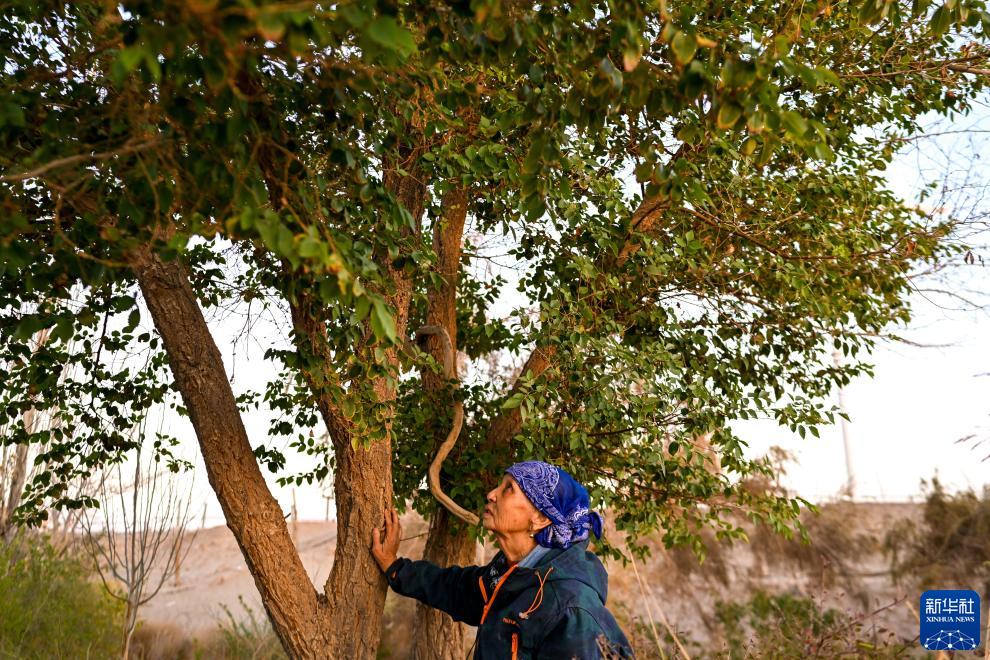 10月27日,德力格在查看當年和蘇和在這里種下的第一棵樹。如今這棵樹已枝繁葉茂。