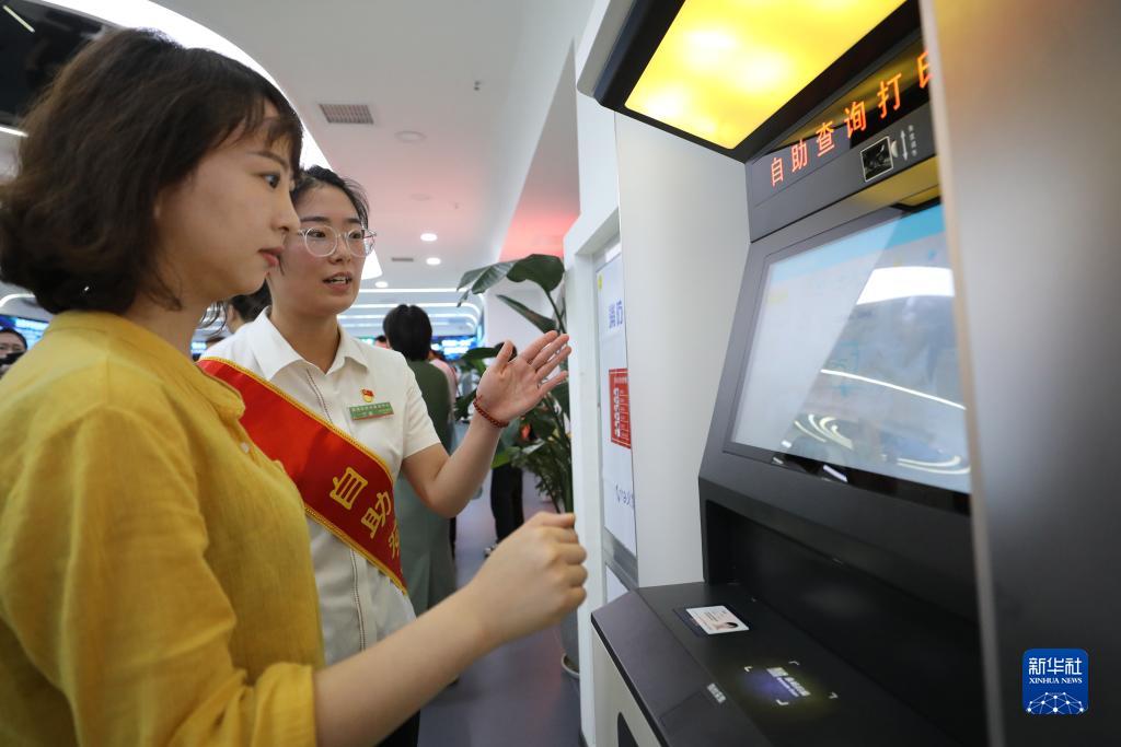 2023年5月30日,在安徽省滁州市政務服務中心,工作人員協(xié)助市民利用自助服務機打證明材料。