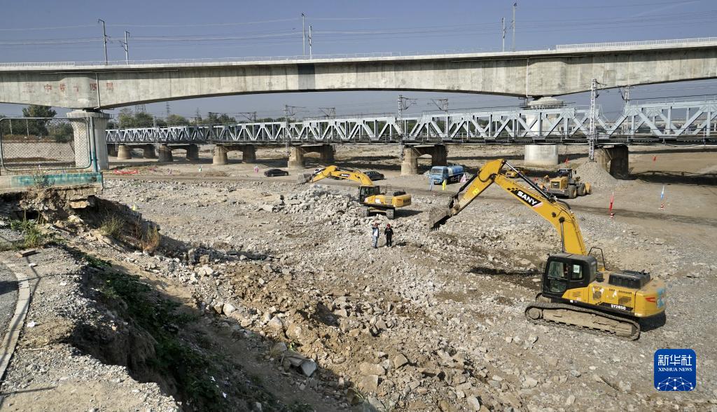 10月30日,施工人員在填埋永定河河道內的洪水沖刷坑。