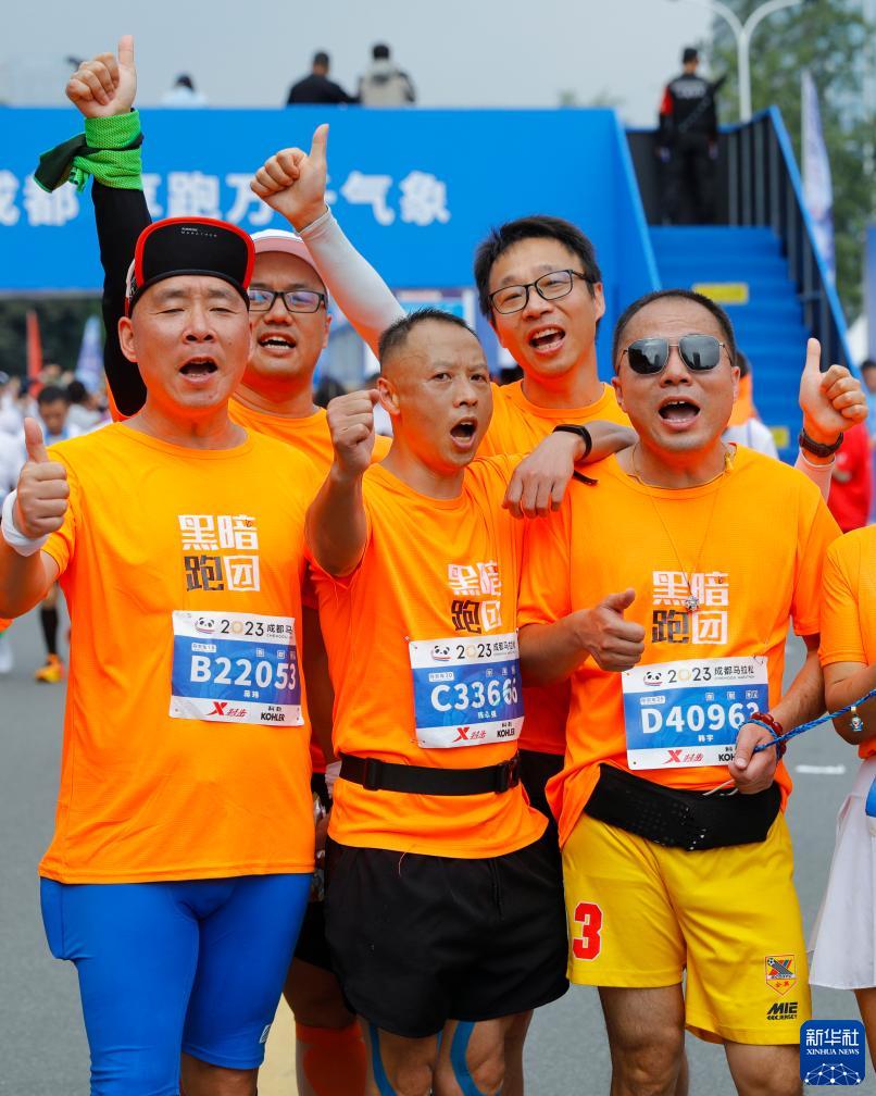 “黑暗跑團”視障跑者陳永強(中)、韓宇(右一)完成2023成都馬拉松全程比賽后與陪跑志愿者歡呼慶祝(10月29日攝)。新華社記者 沈伯韓 攝