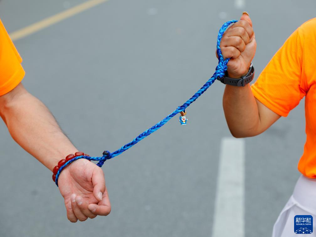 參加2023成都馬拉松全程比賽的“黑暗跑團”視障跑者韓宇(左)與他的陪跑志愿者通過一根陪跑繩聯結在一起(10月29日攝)。新華社記者 沈伯韓 攝