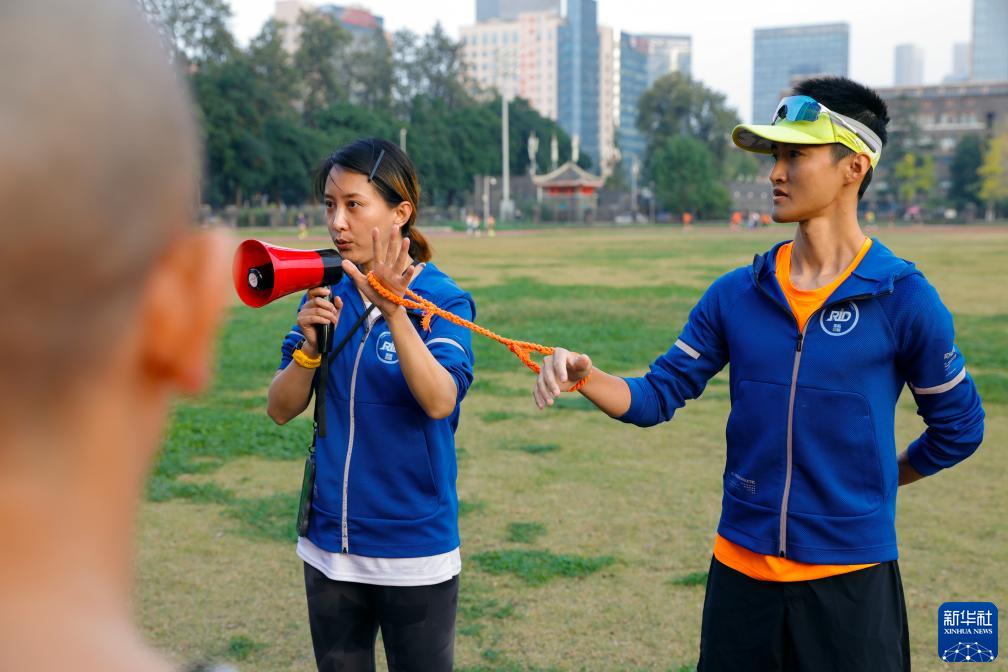 在四川大學(xué)華西校區(qū)運(yùn)動場,“黑暗跑團(tuán)”志愿者陳霞(左)和張志宏向新加入的陪跑志愿者展示如何使用陪跑繩(10月28日攝)。新華社記者 沈伯韓 攝