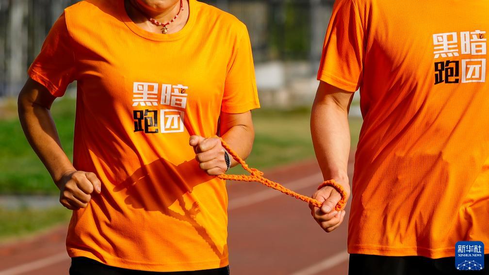 在四川大學華西校區運動場,“黑暗跑團”志愿者許福嬋(左)用陪跑繩帶著視障跑者吳小華訓練(10月28日攝)。新華社記者 沈伯韓 攝