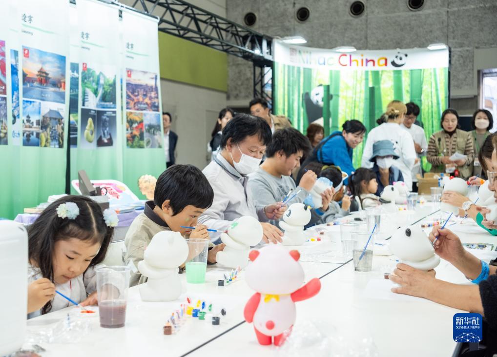 10月28日,游客在日本大阪國際會展中心中國館體驗為熊貓玩偶上色。