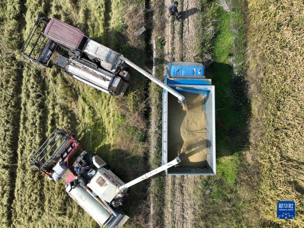 10月30日,江蘇省揚(yáng)州市邗江區(qū)槐泗鎮(zhèn),農(nóng)民將收獲的水稻裝車(無人機(jī)照片)。