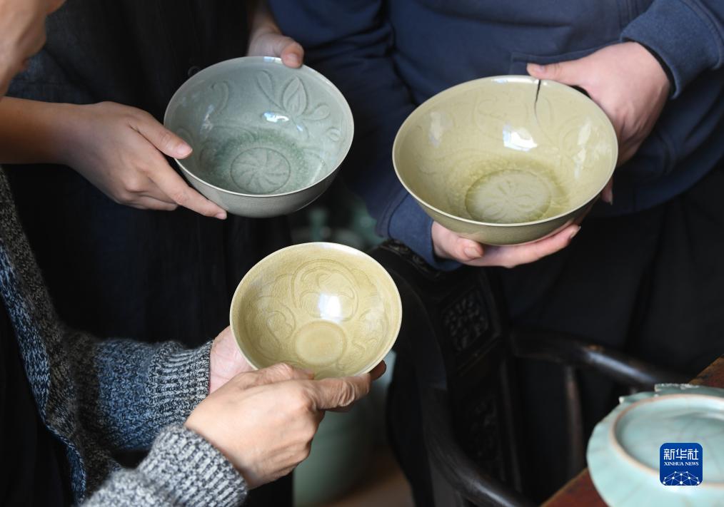 10月31日,在陶瓷文化學者蔡劍青的家中,季雙俊和季資美拿著他們試做的刻劃花碗和北宋龍泉窯的碗(下)做比較。