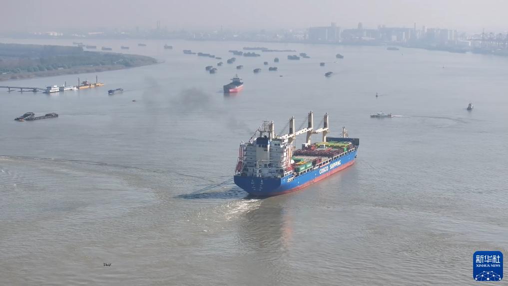11月1日,“天惠”輪貨船駛離張家港港(無(wú)人機(jī)照片)。