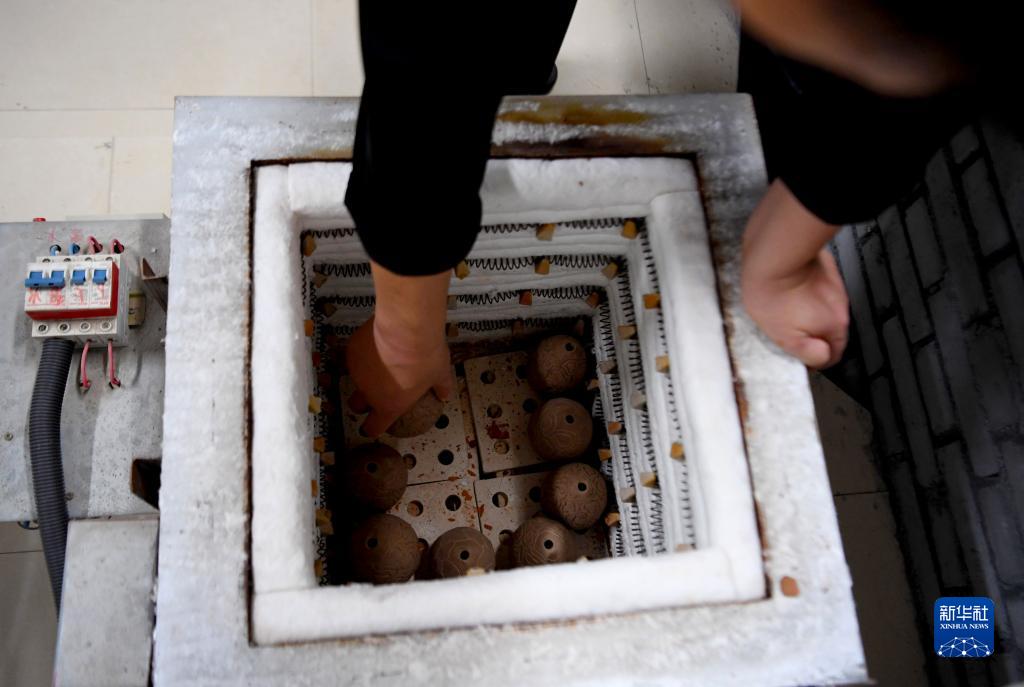 10月31日,在河南省武陟縣黃河交通學院工作室,王建準備燒制黃河泥塤。