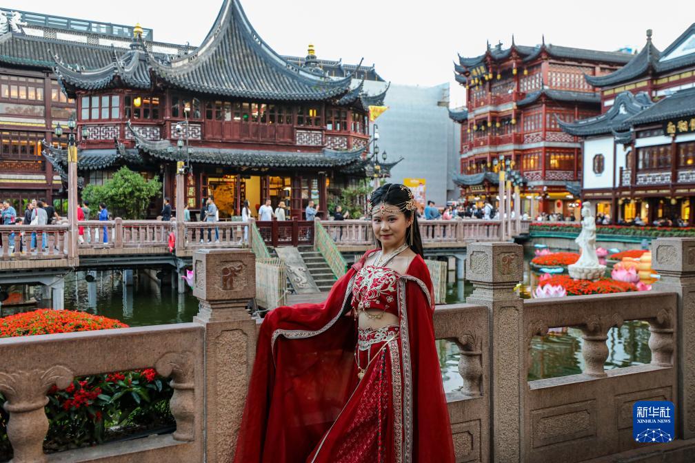 10月11日,游客在上海豫園湖心亭拍照留念。