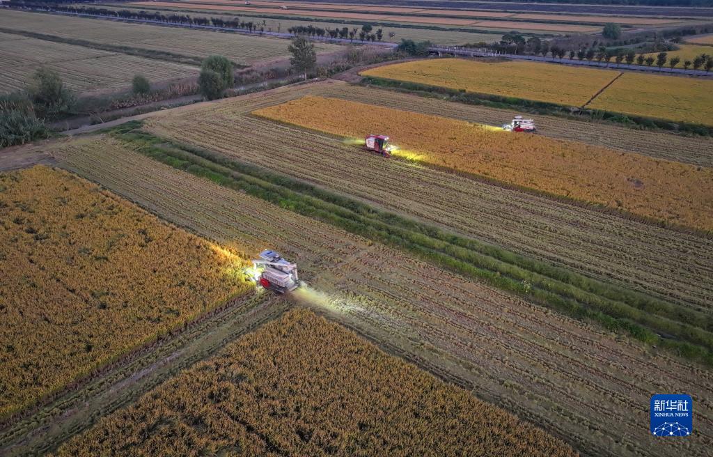 10月31日傍晚,在江蘇省南通市崇川區幸福街道的一塊高標準農田,收割機在打燈收割水稻(無人機照片)。