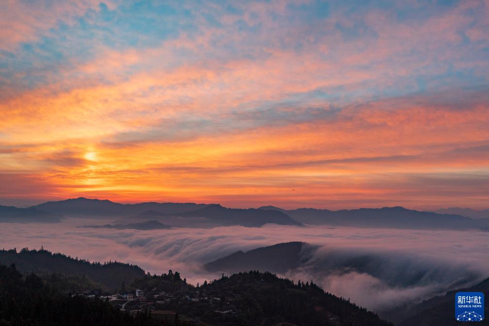 這是10月31日拍攝的貴州省從江縣高增鄉(xiāng)新生村日出景觀(無人機(jī)照片)。