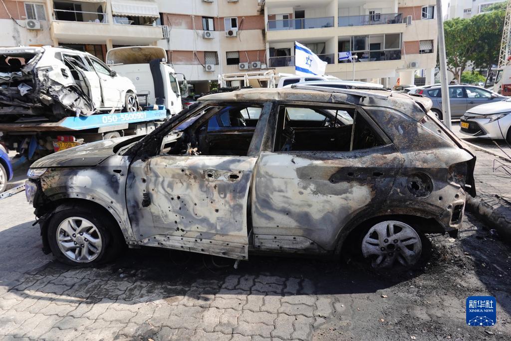 這是11月1日在以色列南部城市阿什杜德拍攝的遭火箭彈襲擊后損毀的車輛。