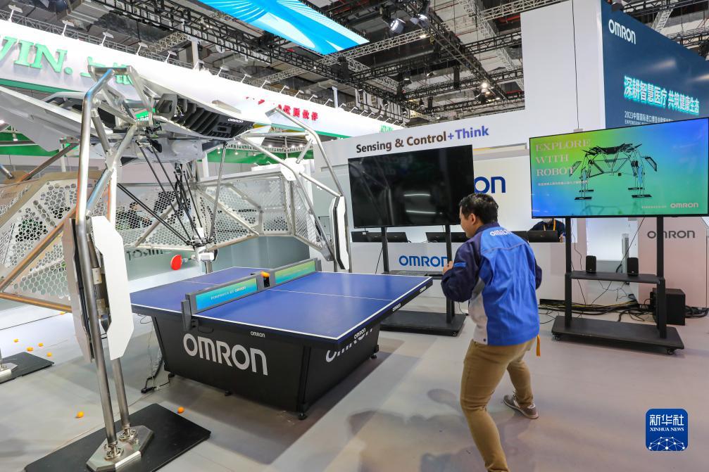 11月2日,工作人員在歐姆龍展位測試乒乓球教練機器人。