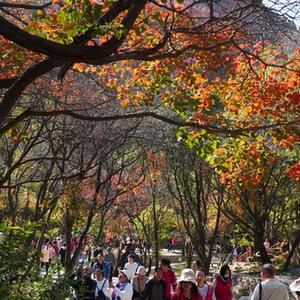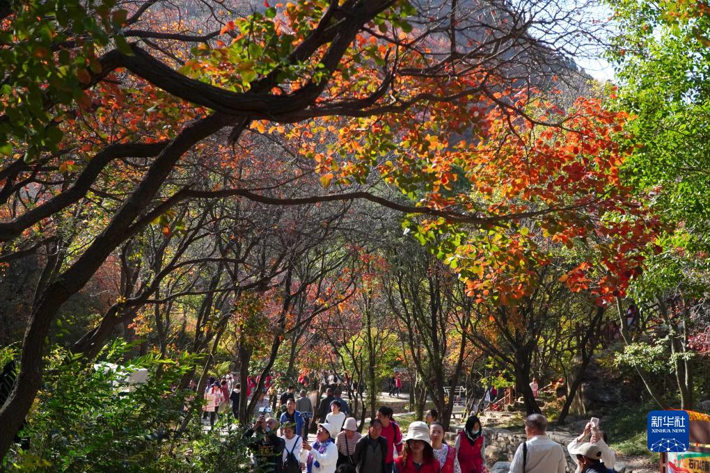 金秋時節,山東省濰坊市臨朐縣石門坊景區內紅葉漫山,層林盡染,吸引游客前來觀賞游玩。