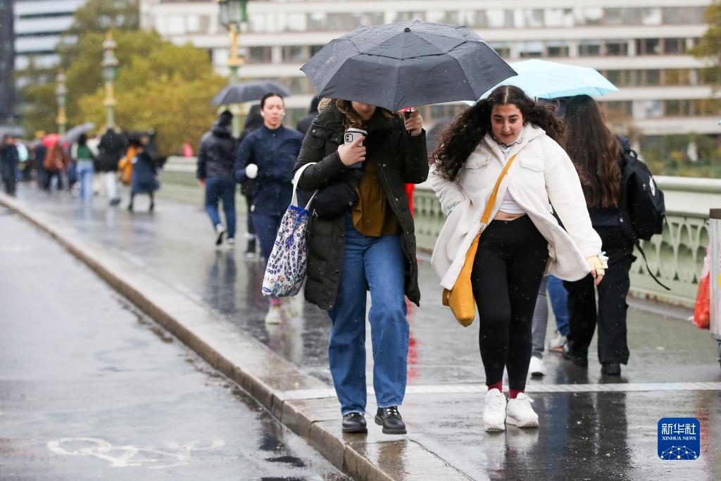 11月2日,在英國倫敦,人們打著傘走在威斯敏斯特橋上。