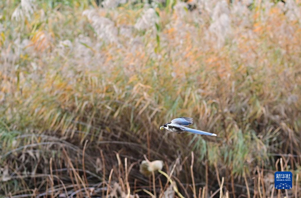 11月3日,一只灰喜鵲在北京頤和園耕織圖景區覓食。