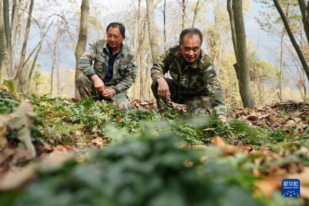 11月2日,技術人員在鎮坪縣城關鎮友誼村黃連林下經濟示范園內查看黃連長勢。
