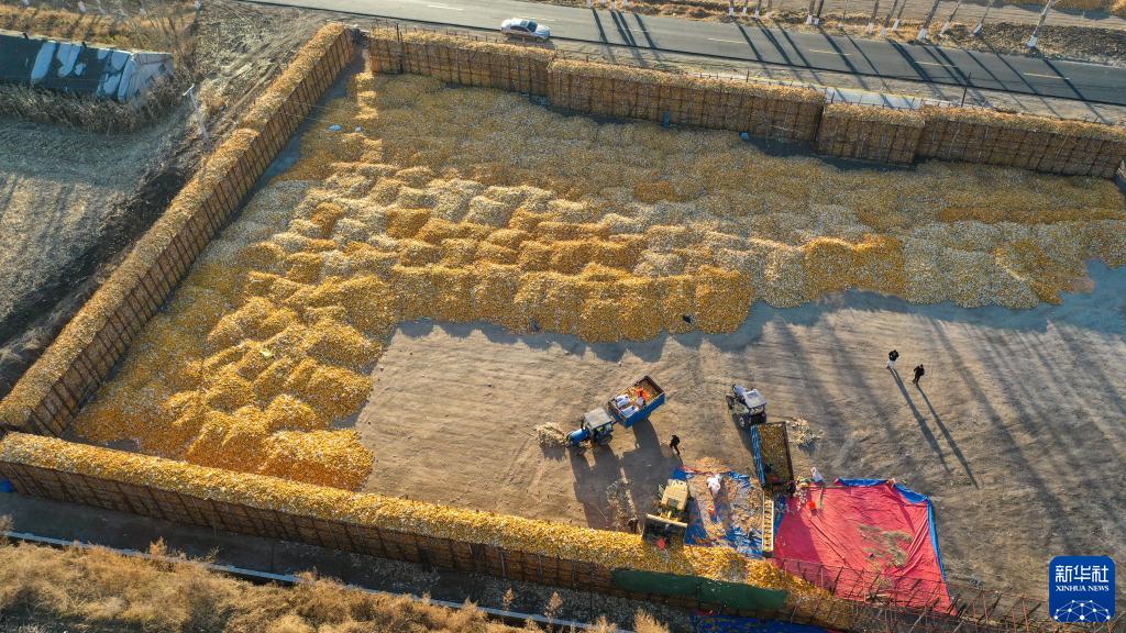10月30日,在吉林省德惠市達(dá)家溝鎮(zhèn)杏山村大春家庭農(nóng)場(chǎng),農(nóng)民將收獲的玉米裝進(jìn)科學(xué)儲(chǔ)糧倉(無人機(jī)照片)。