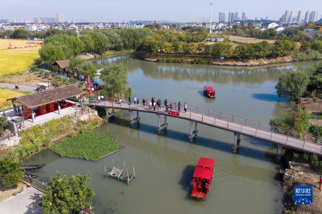 坐上大花轎、走過合歡橋、跨過紅火缸、同乘幸福船……11月3日,一場“良緣水鄉締 佳偶自天成”水鄉集體婚禮在浙江省杭州市臨平區塘棲鎮丁河村新建成的“丁山湖魚鷹愛情故事婚禮基地”舉行。八對新人在村民和游客的見證下喜結良緣,并發出《婚俗改革倡議書》,向廣大適婚青年傳播新時代的婚戀觀,倡導健康文明的嫁娶新風尚。該婚禮基地依托水鄉風貌,已成為當地特色鄉村文旅品牌。