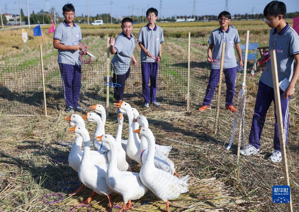 11月2日,孩子們在豐收市集里參加大鵝套圈趣味游戲。