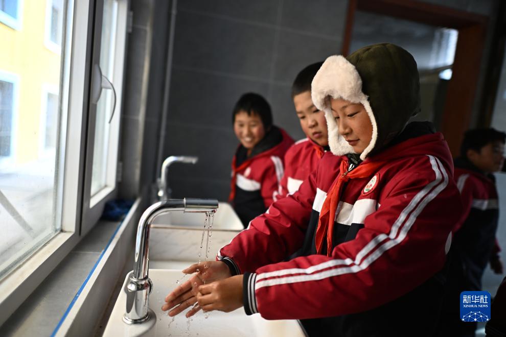 在青海省果洛藏族自治州瑪多縣花石峽鎮藏文中心寄宿制學校,五年級學生東桑(右一)在使用廁所后洗手,該學校是環境衛生特別項目學校之一(11月2日攝)。