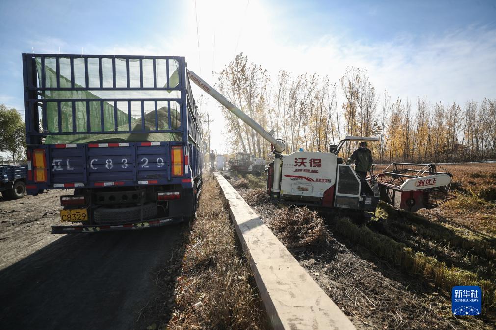 11月3日,農戶在盤錦市大洼區王家街道興海村將收割的水稻裝車。