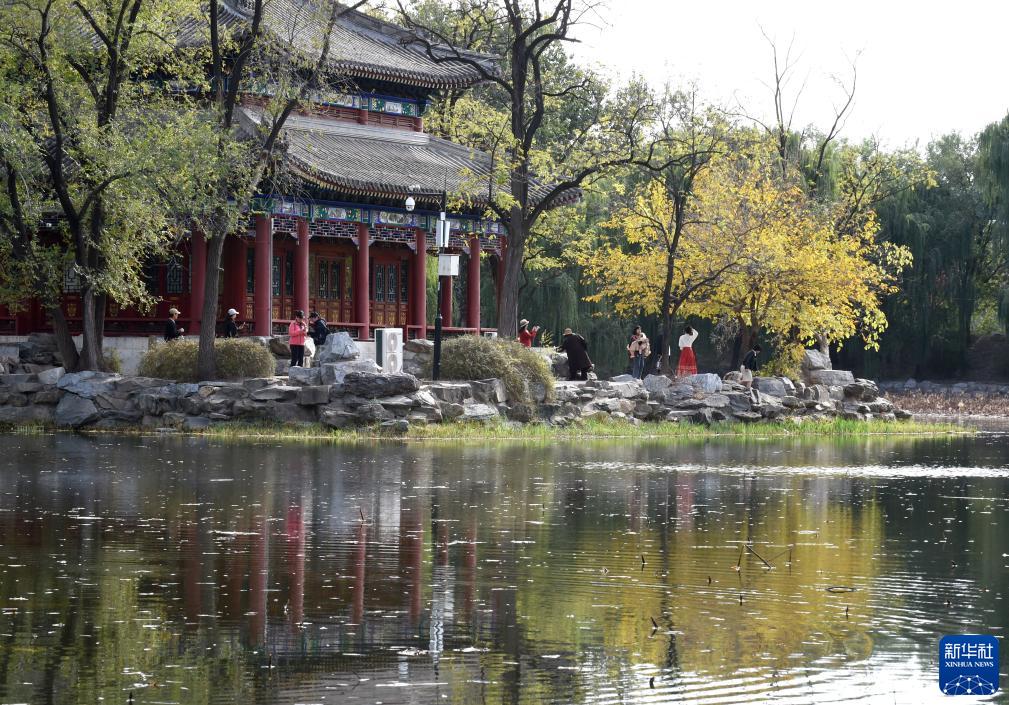 深秋時節,北京圓明園內層林盡染,園內種植的銀杏、白蠟樹、楓樹、槭樹、黃櫨等彩葉觀賞樹種,色彩斑斕,形成多個彩葉觀賞區,吸引眾多游客駐足觀賞、留影。