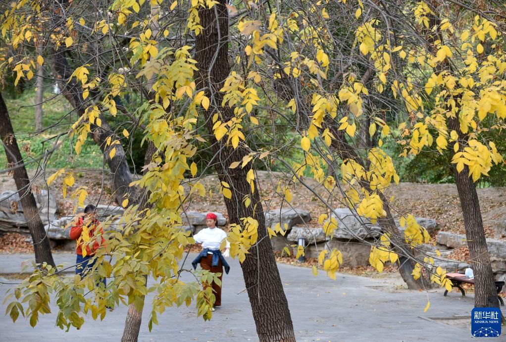 深秋時節,北京圓明園內層林盡染,園內種植的銀杏、白蠟樹、楓樹、槭樹、黃櫨等彩葉觀賞樹種,色彩斑斕,形成多個彩葉觀賞區,吸引眾多游客駐足觀賞、留影。