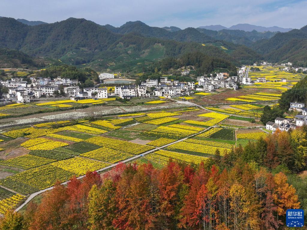 11月3日在安徽省黃山市歙縣溪頭鎮(zhèn)桃源村拍攝的菊花田(無人機照片)。