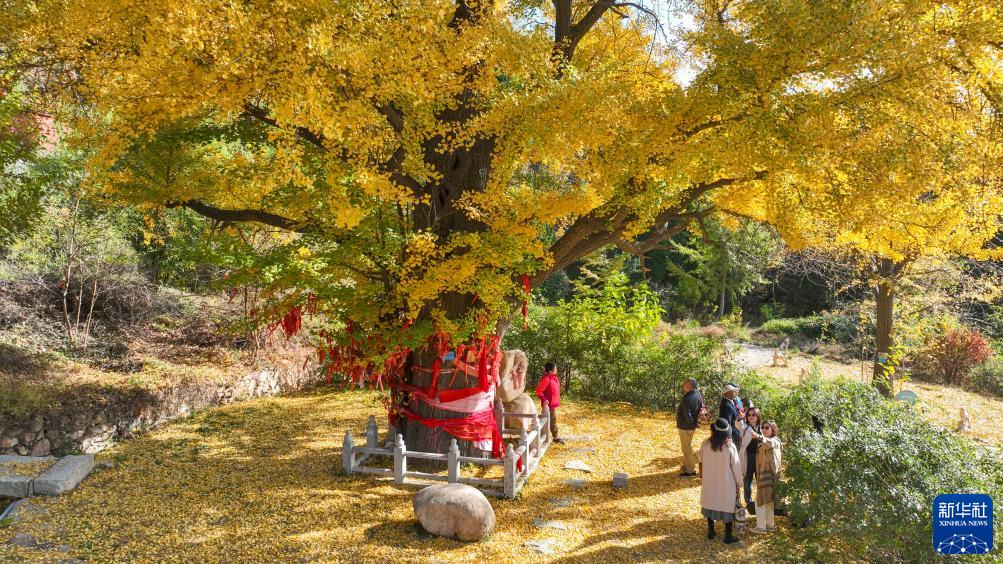 11月3日,游客在河北省遵化市侯家寨鎮禪林寺古銀杏樹風景區游玩(無人機照片)。