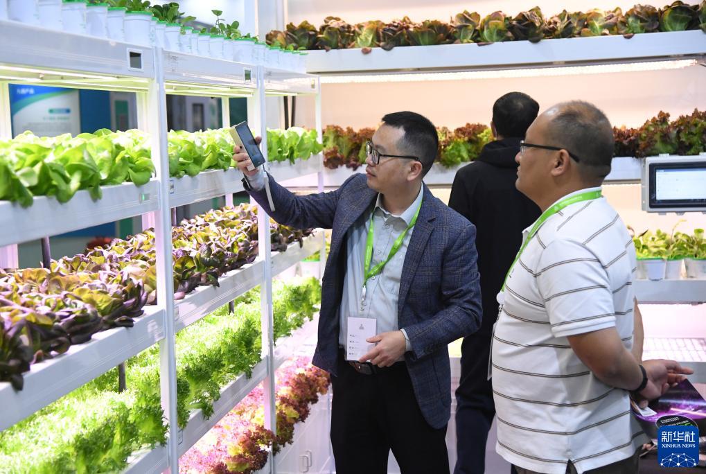 11月2日,工作人員(左)在世界農業科技博覽會現場介紹智慧植物工廠。