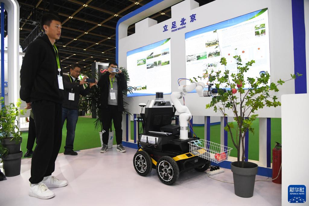 這是11月2日在世界農業科技博覽會現場拍攝的一款智能采摘機器人。