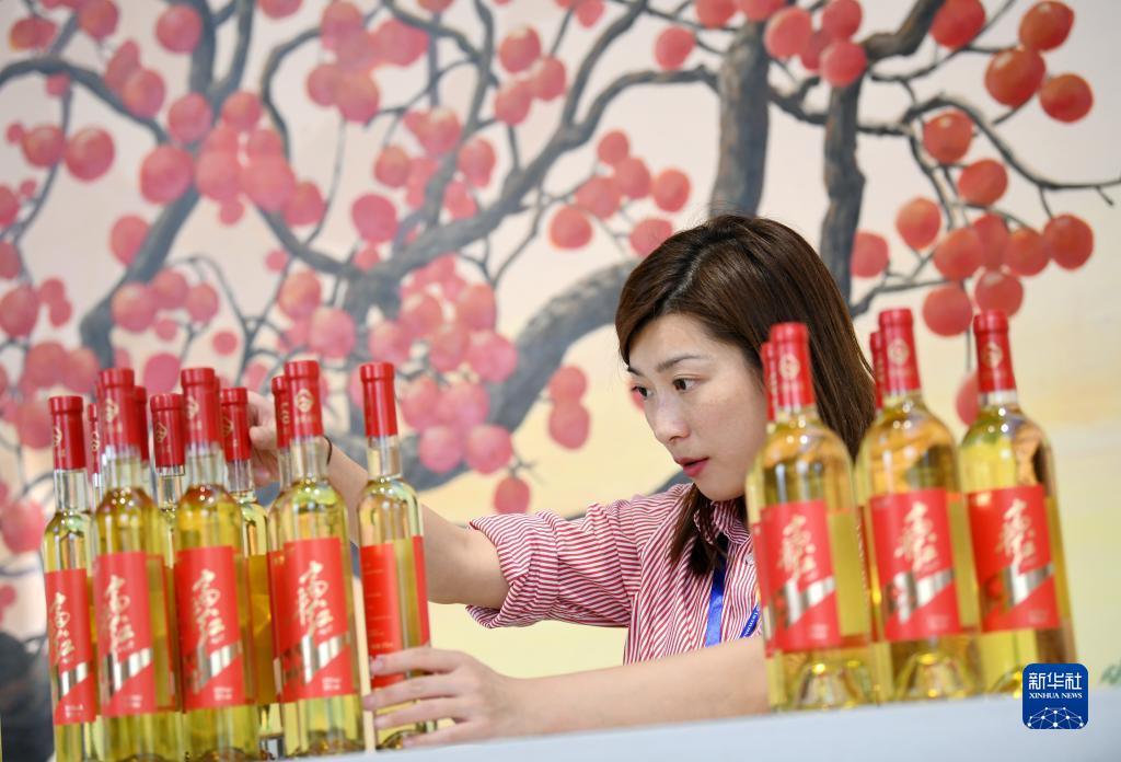 11月2日,在位于陜西省富平縣的云集柿業富平柿園綜合項目接待中心,云集柿業總經理王薇布置展臺上的柿子酒產品。