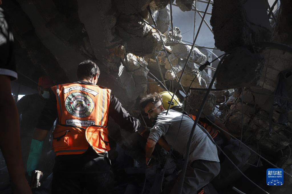 11月3日,在加沙地帶南部城市汗尤尼斯,人們在遭襲擊后的建筑廢墟上實施救援。