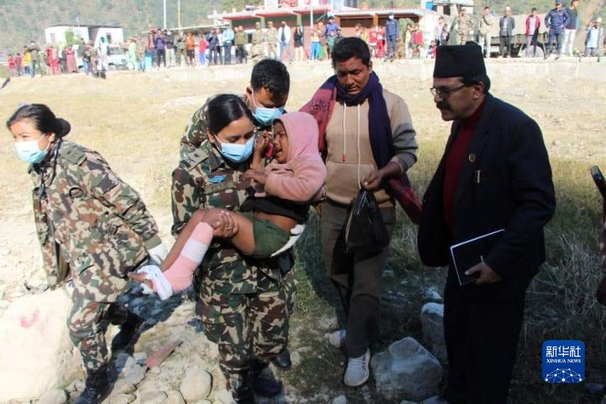 11月4日,尼泊爾軍方人員在尼泊爾西部扎澤爾果德參與救援行動。