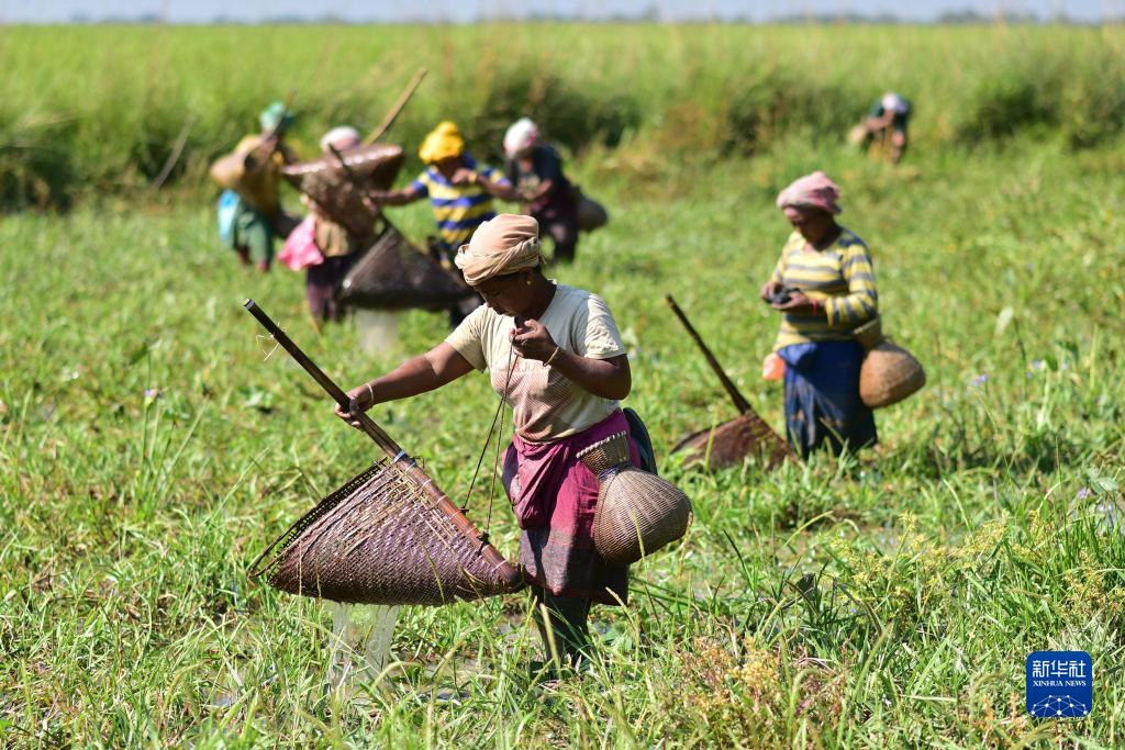 10月30日,印度阿薩姆邦納岡地區(qū)的女子在一處濕地捕魚。